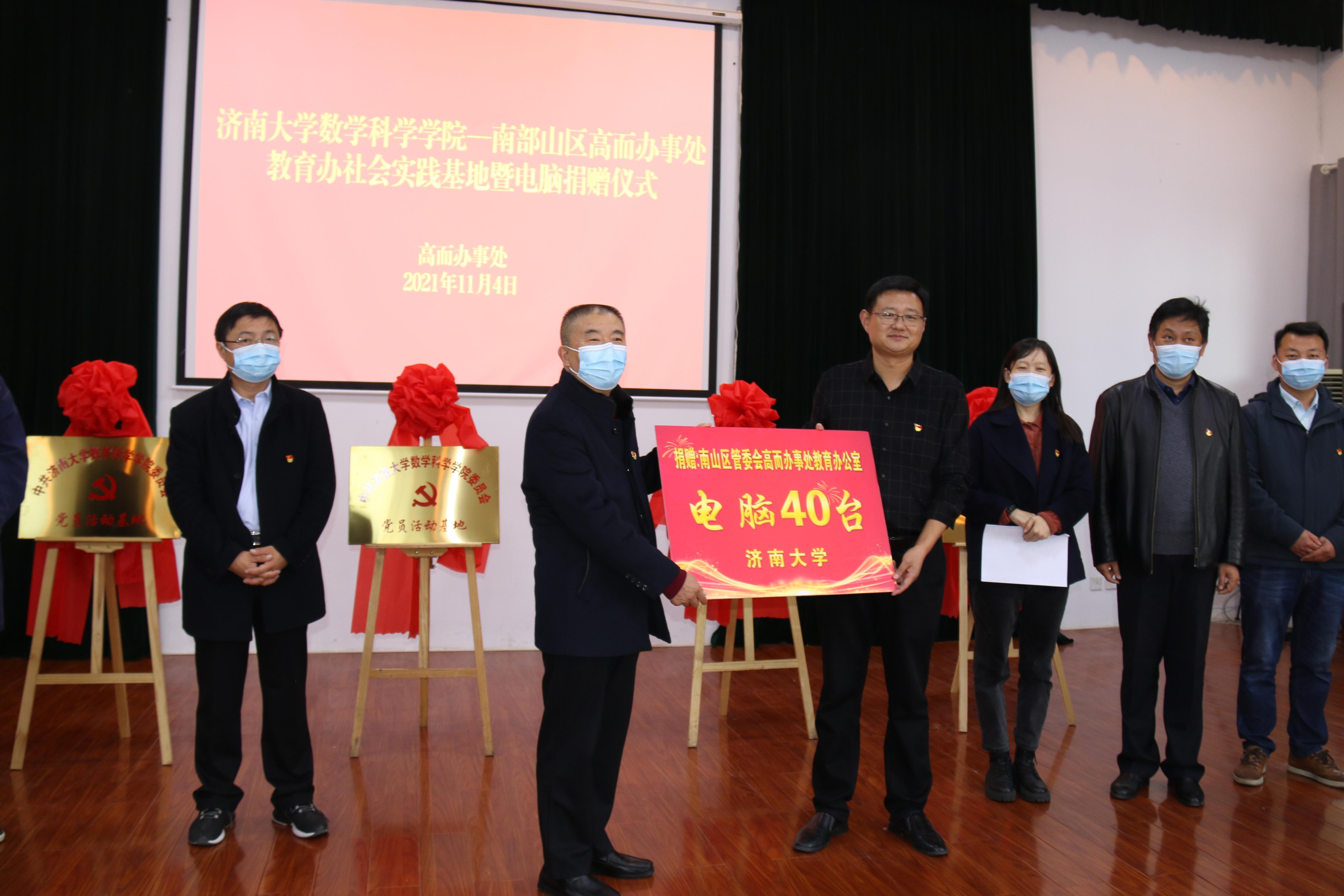 签约现场,英国365集团官网党委书记侯启海代表济南大学向南山管委会高而办事处中小学捐赠了40台电脑。
