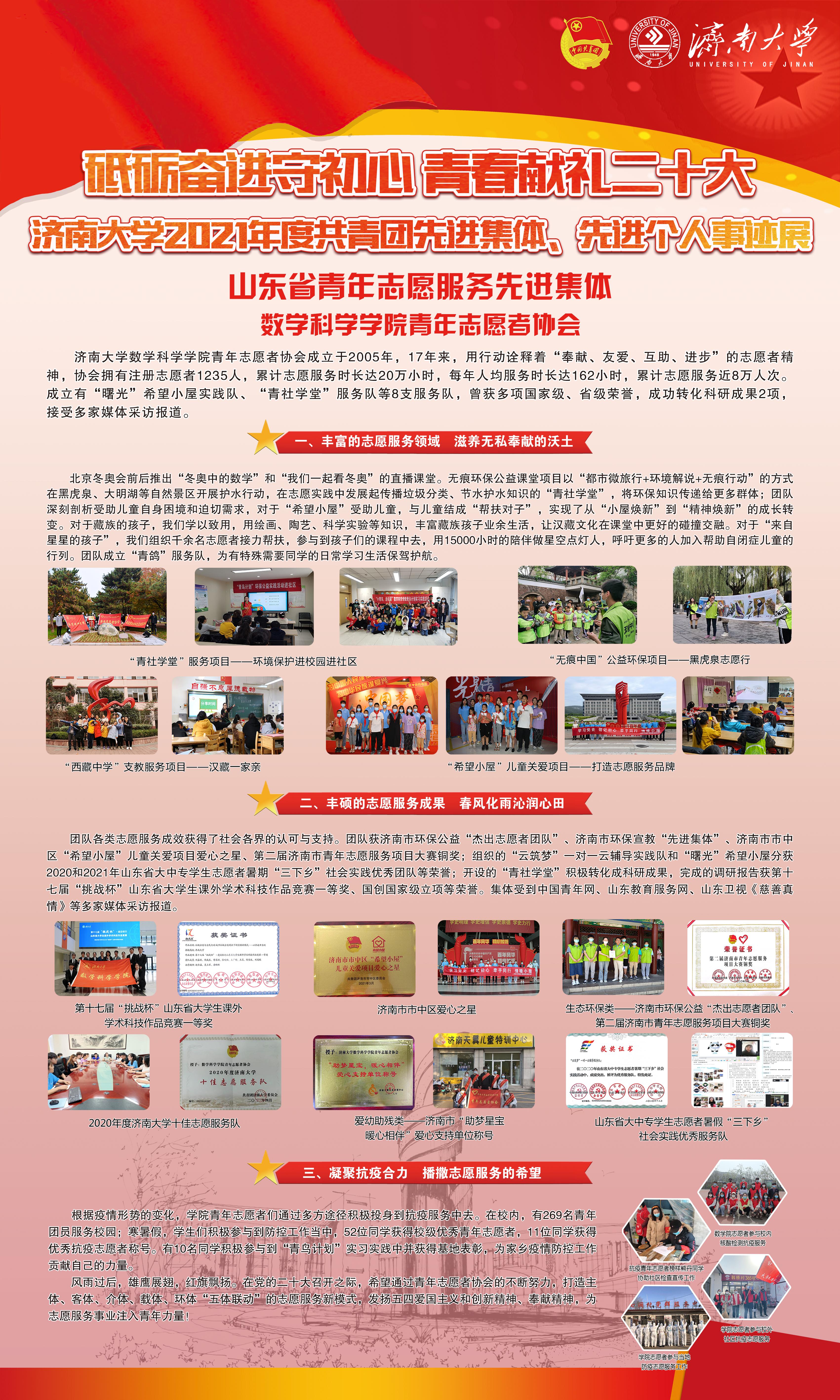 为表彰先进、树立典型,激励全省各级团组织和广大团员青年、团干部向先进学习、向优秀看齐,共青团山东省委决定授予青岛市青年志愿者抗疫突击队等50个集体山东省青年志愿服务先进集体称号。我院青年志愿者协会榜上有名,成为2021-2022年度我校唯一一支获此殊荣的志愿者团队。