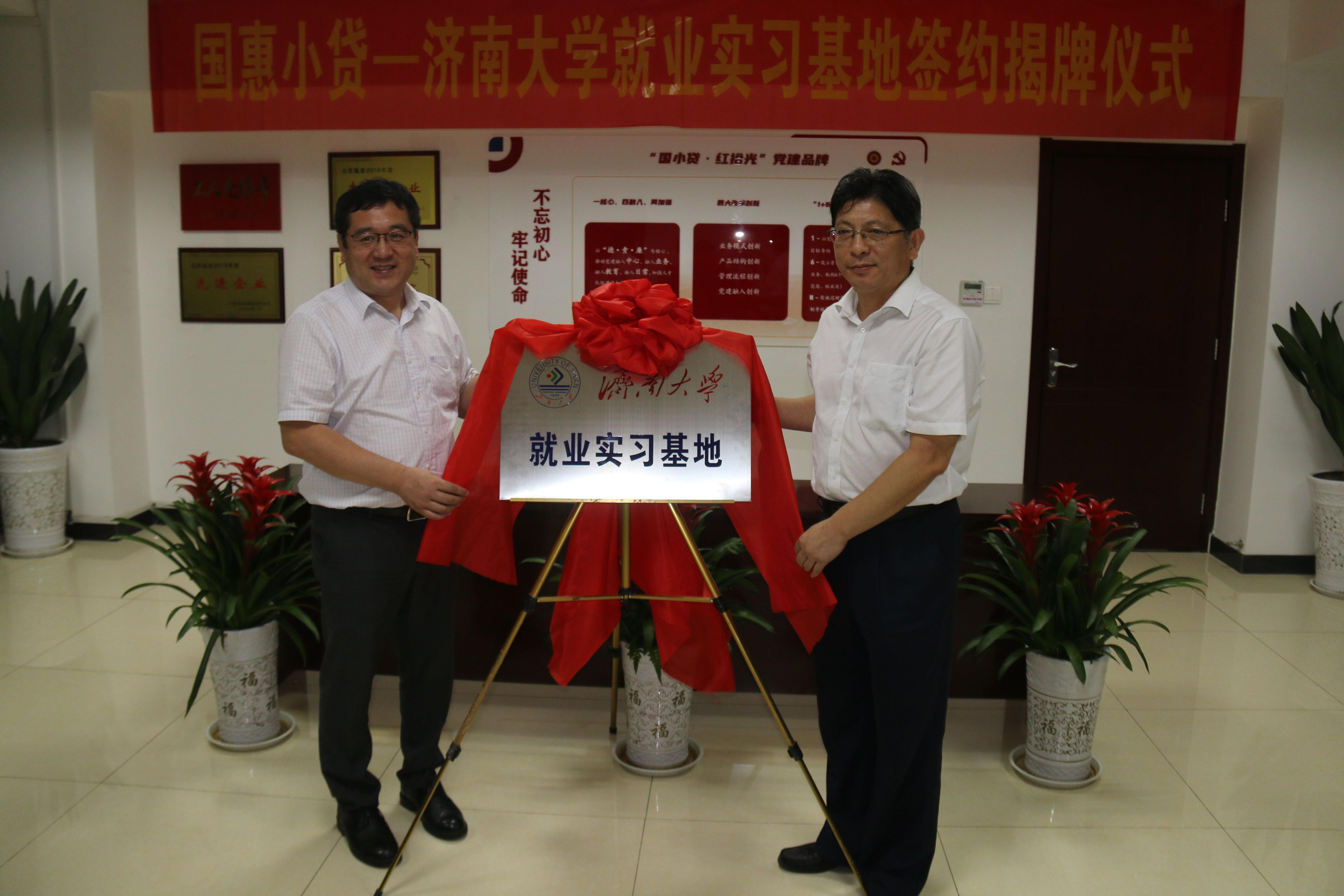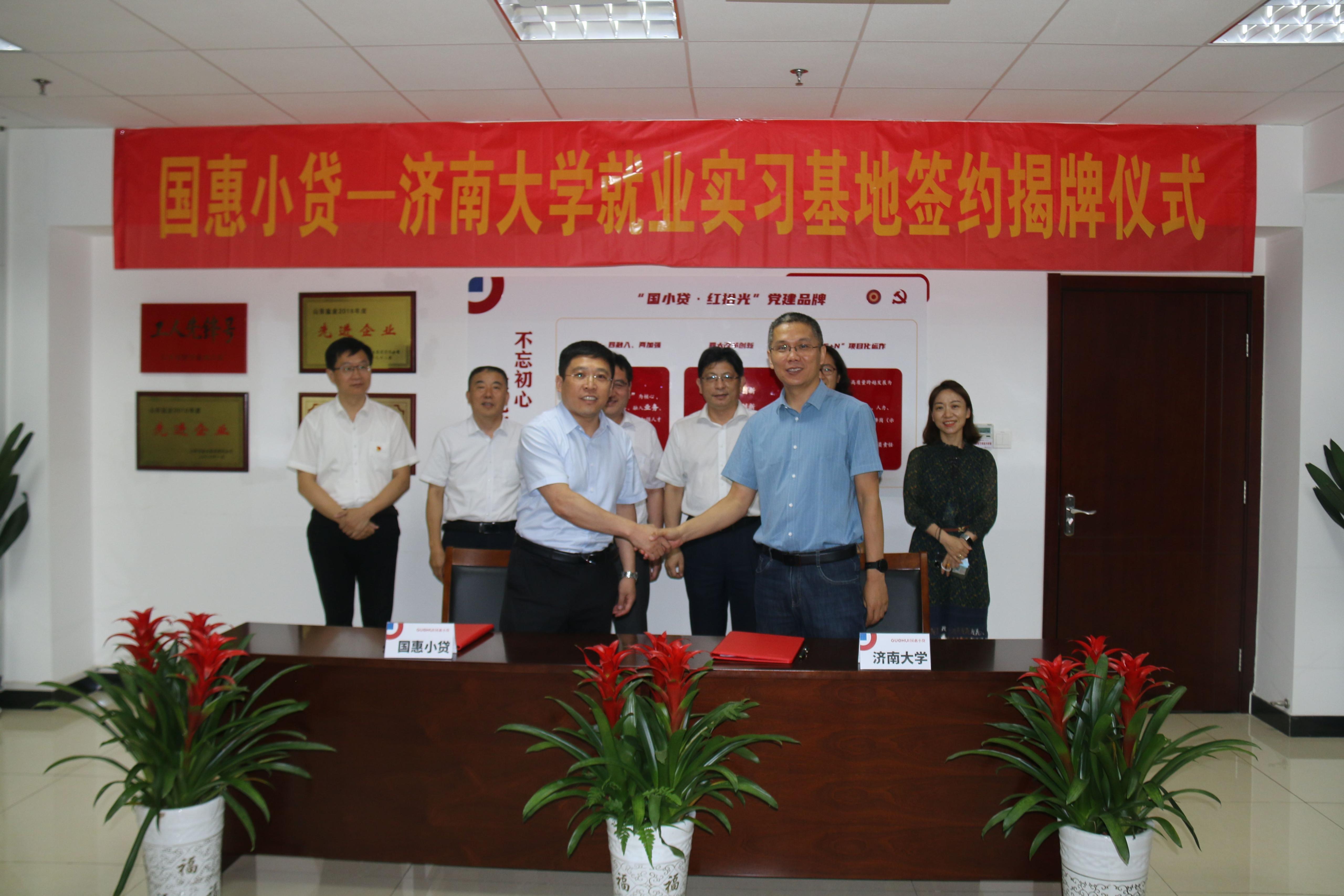 在山东国惠小额贷款有限公司,单一春介绍了公司“十四五”战略发展规划、基本情况、党建品牌、企业文化以及人才“引用育留”机制,表达了希望更多优秀毕业生加入企业的愿望。杨景波与杜冰共同为“济南大学就业实习基地”揭牌。孙元功、单一春代表校企双方共同签署了《共建济南大学毕业生就业基地协议书》。