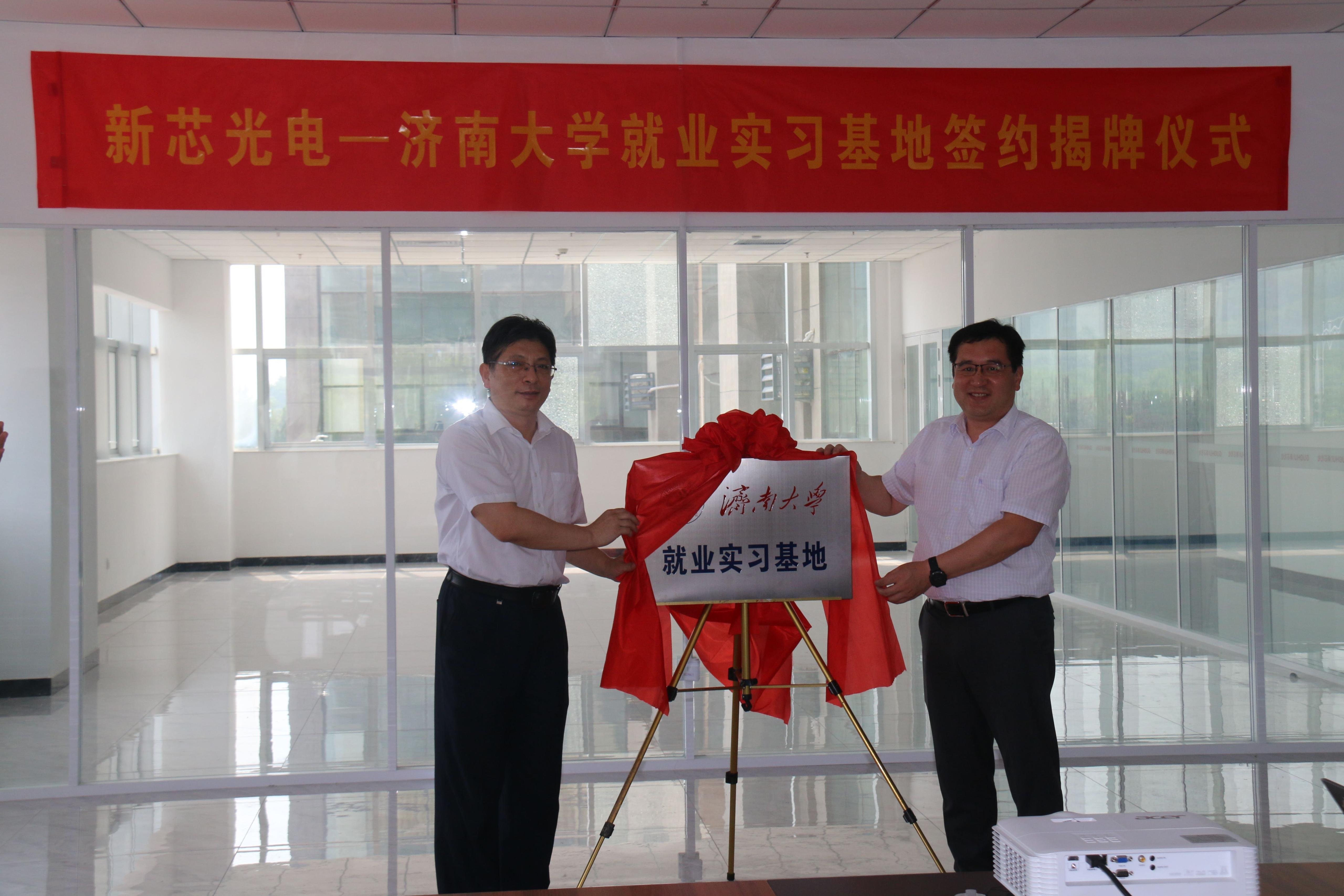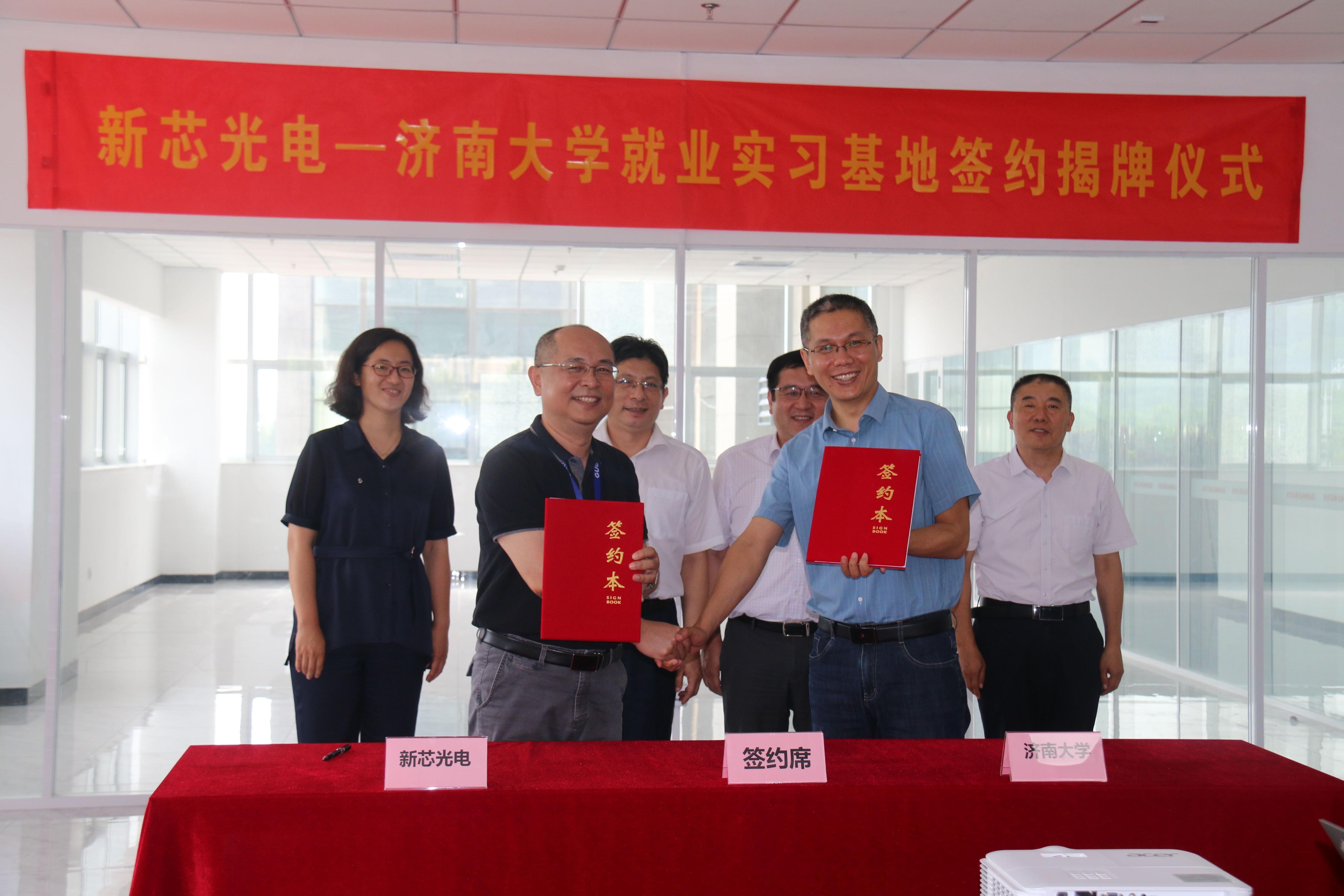 在山东国惠新芯光电科技有限公司,杨景波一行实地参观了公司芯片生产线,杜冰等人陪同并参加座谈会。座谈会上,杜冰对杨景波一行表示热烈欢迎,介绍了新芯光电科技有限公司的发展概况、主营业务、战略布局等情况,希望以此为契机,积极探索培训、讲学、报告、联合技术开发等方面的校企合作新模式。杨景波介绍了济南大学的办学规模、学科建设、人才培养、产教融合等基本情况,希望双方在已有合作基础上,进一步拓宽合作广度和深度,强化在科学研究、成果转化、人才需求、专业培养等方面的交流合作,携手推动校企合作再上新台阶。学院党委书记侯启海简要介绍了学院的师资队伍、人才培养、学生实习实践等情况,希望通过共建就业实习基地,进一步加强供需对接,在人才培养、学生就业实习等方面达成共识,深化产教融合、拓展合作领域,实现“优势互补、资源共享、互利共赢、共同发展”。杨景波与杜冰共同为“济南大学就业实习基地”揭牌。孙元功、沈镇代表校企双方共同签署了《共建济南大学毕业生就业基地协议书》。