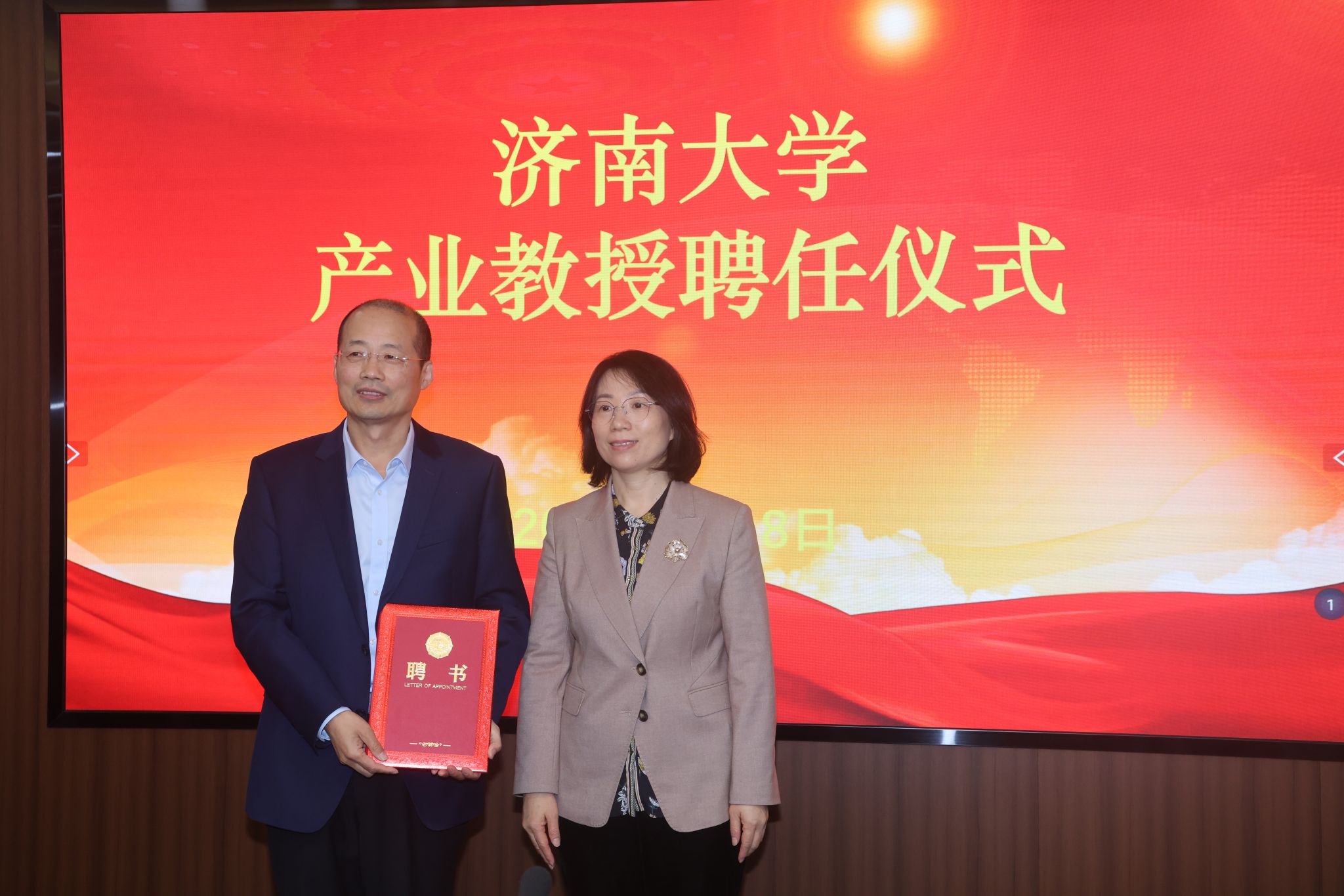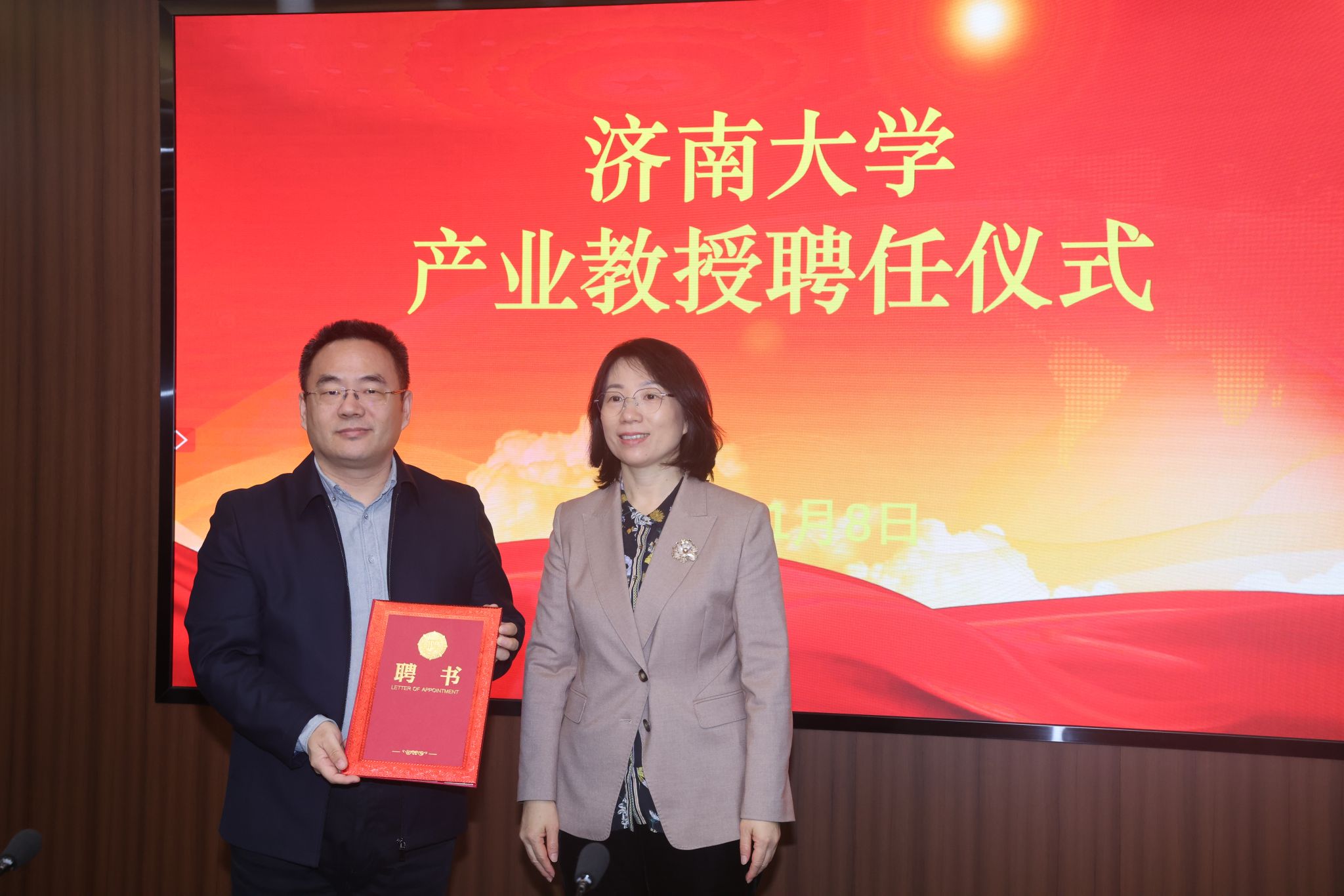 会上举行了济南大学产业教授聘任仪式,王霞为张峰、蒋孝军颁发了聘书。