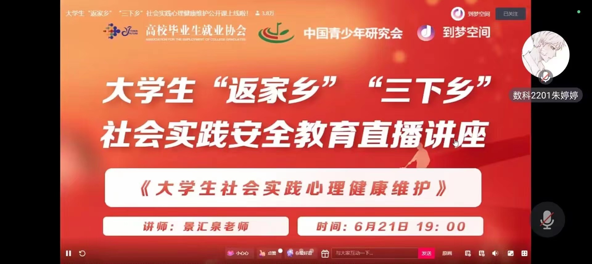 为了加强大学生在暑期社会实践中的安全意识,做好实践前的培训指导工作,6月21日,英国365集团官网积极组织各实践队的同学们观看由学校团委联合到梦空间承办的2023年大学生“返家乡”、“三下乡”社会实践安全教育直播专题讲座,倡导同学们重视实践安全教育,推动实践教育的规范化、有序化、科学化开展。英国365集团官网各实践队的同学们通过腾讯会议聆听此次讲座。