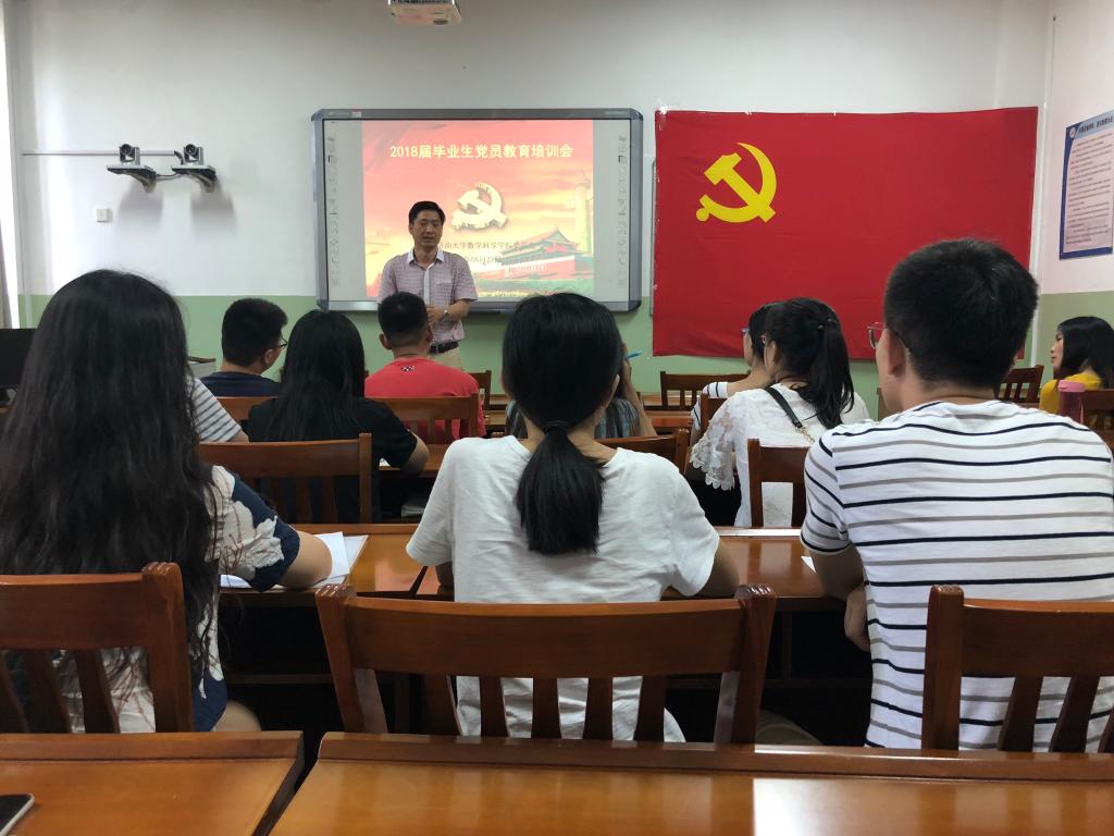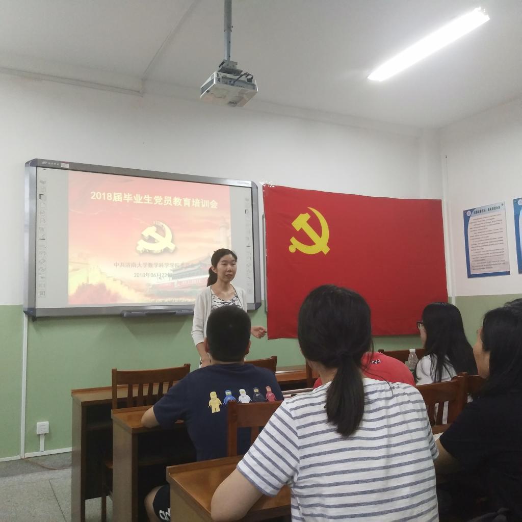 为引导毕业生党员站好最后一班岗,充分发挥先锋模范作用,2018年6月22日下午2点30分,2018届毕业生党员最后一次党课在济南大学第七教学楼微格教室举行。会议由英国365集团官网党委书记韩振来,党委副书记孟德洋老师主讲,2016级辅导员赵华磊老师和2018届全体毕业生党员参加。
