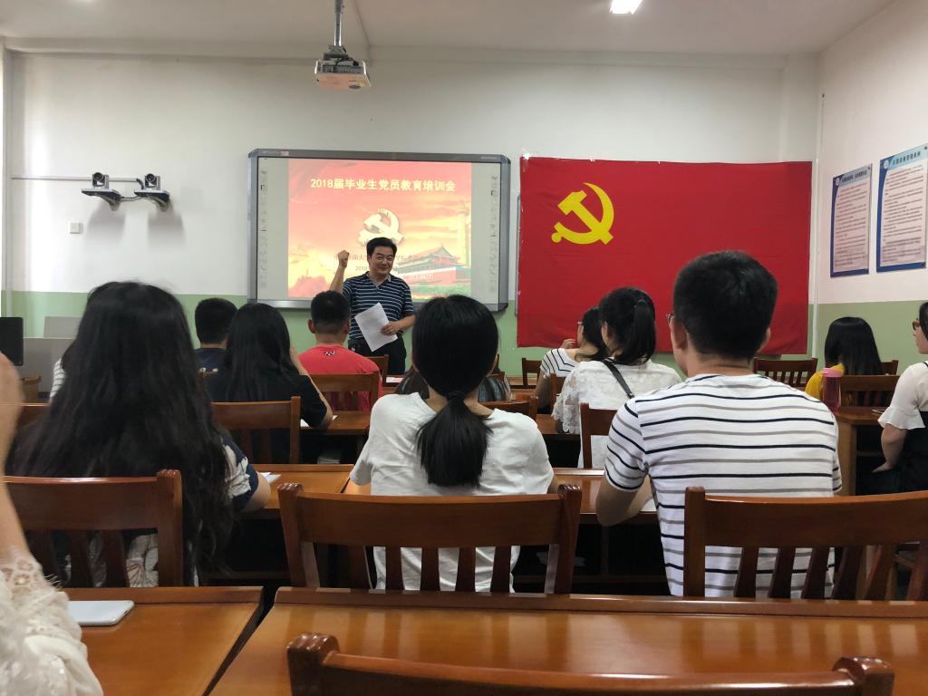 教育培训会由四个环节组成。首先,由韩书记带领毕业生党员重温入党誓词,同学们对着党旗,再次许下了铮铮誓言。之后,韩书记就同学们的毕业后发展方向,在校期间的党员素质培养,牢记习总书记教诲等三方面进行授课,并带领大家深入学习了习总书记在北京大学师生座谈会上的讲话。最后,韩书记用习总书记的话进行总结,并为同学们提出了四点要求:立国,立志,求真,立行。之后,孟书记就毕业生党员注意事项进行授课,他对毕业生党员应尽的义务,应承担的责任进行了深入剖析,并鼓励同学们踏实走好脚下的路。最后,由赵华磊老师组织开展主题党日教育:感恩母校,文明离校。她要求同学们在文明离校过程中发挥党员榜样示范作用,在走向社会后,继续秉承“弘毅 博学 求真 至善”的校训,为党旗添彩,为母校增光。