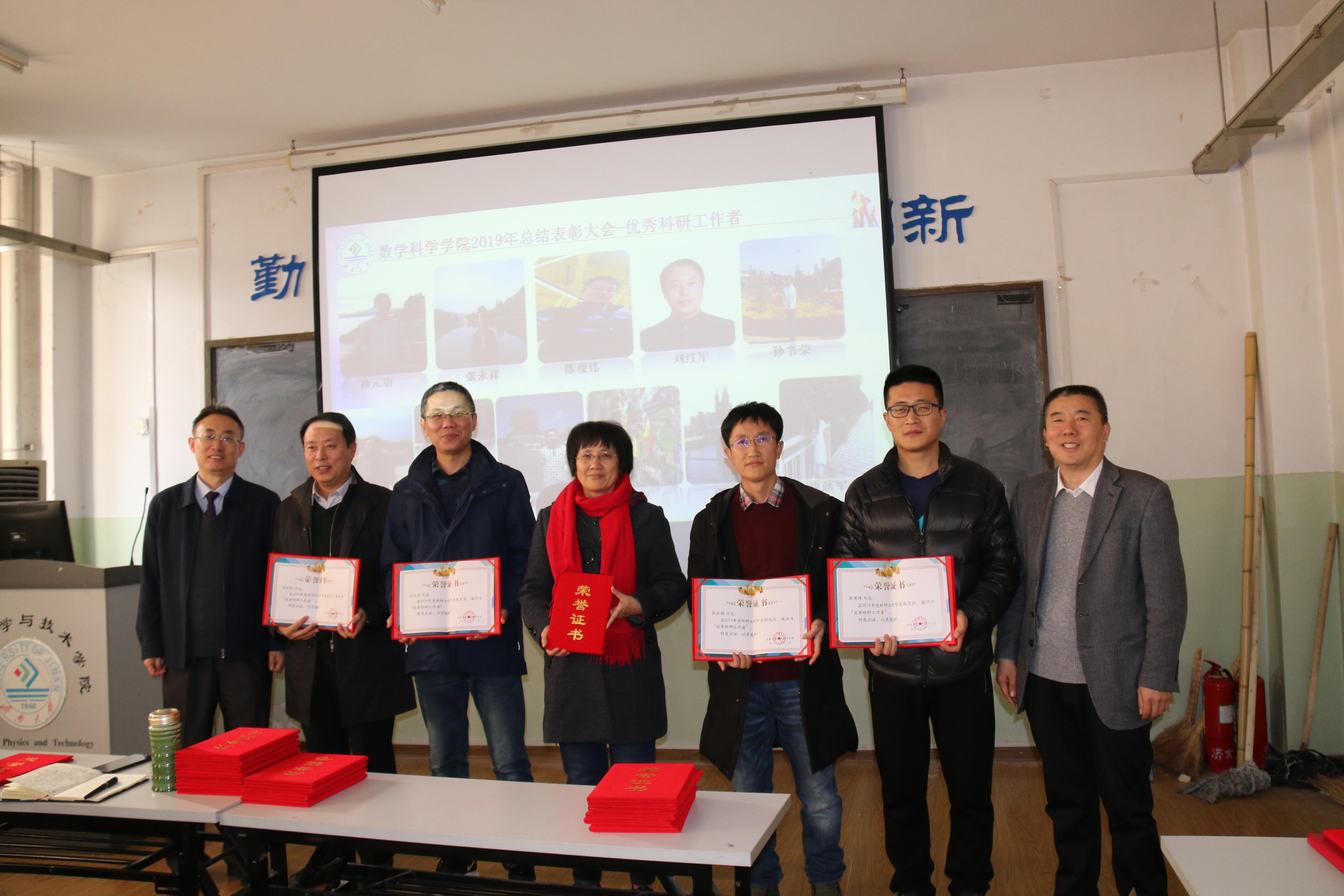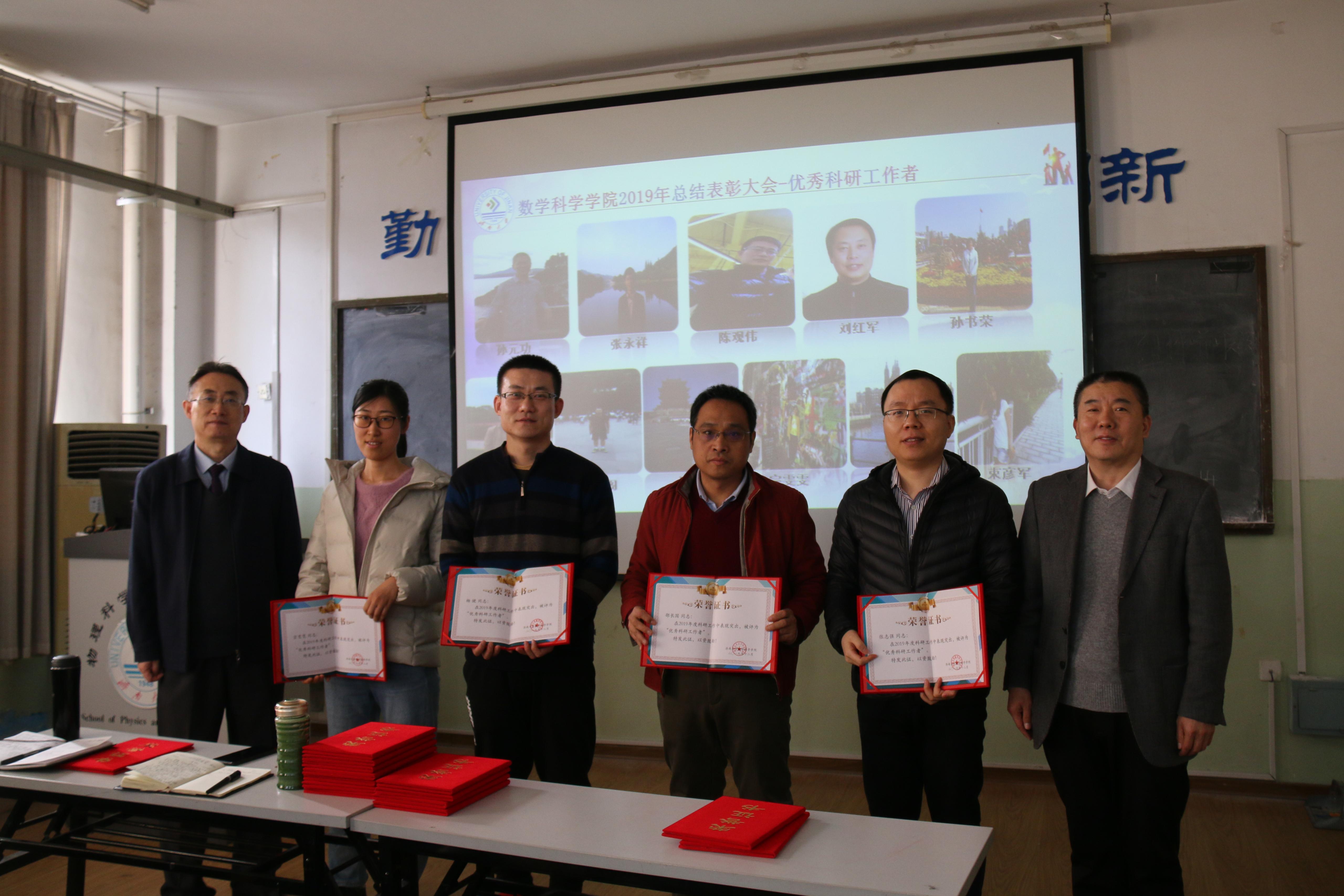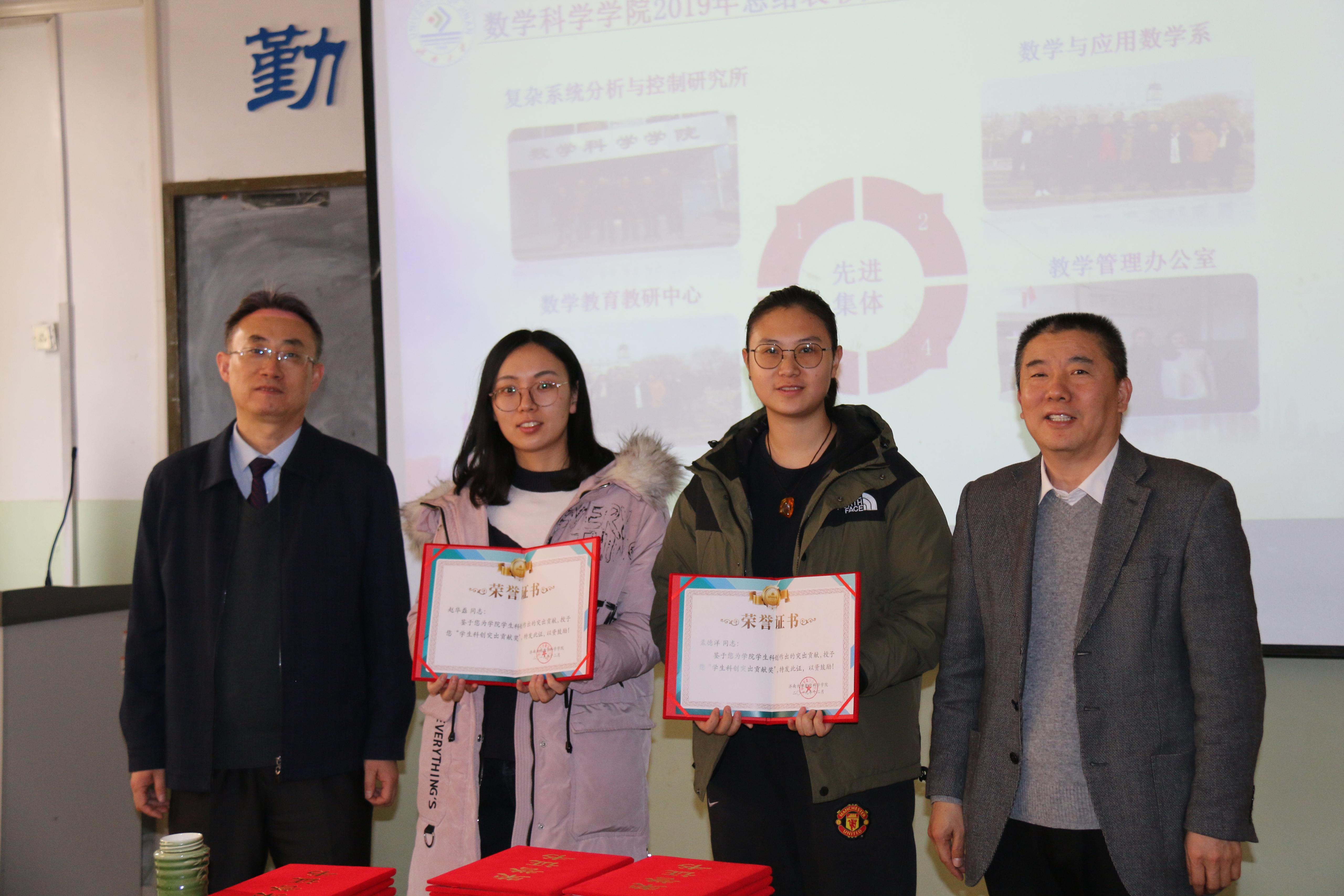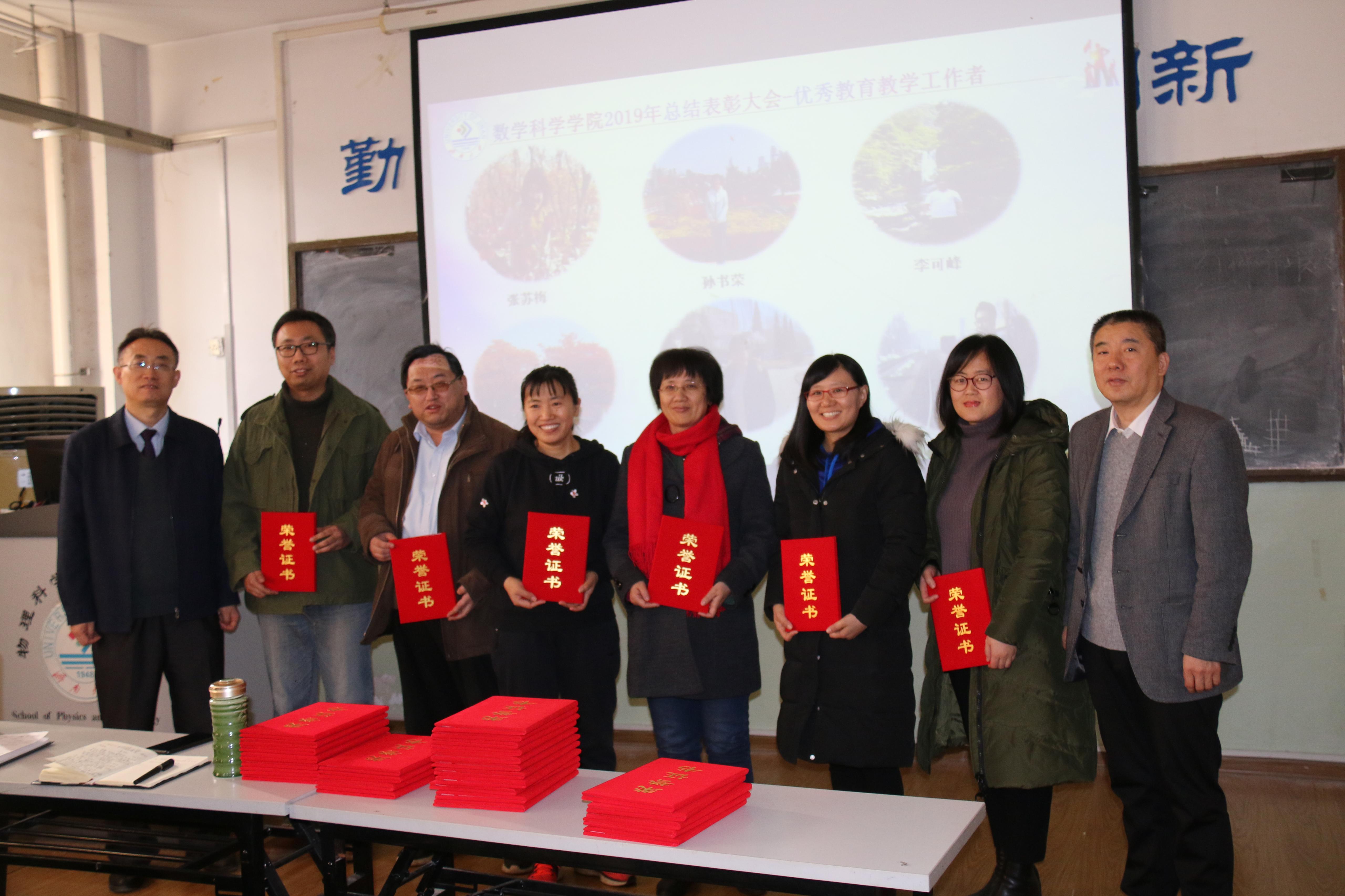 孙元功荣获学院学科建设突出贡献奖,孟德洋、赵华磊荣获学生科创突破奖,张苏梅、孙书荣、李可峰、陈兆英、刘春燕、张超、孙莹、韩振来、张永祥、郑艳玲、冯琳荣获 “优秀教育教学工作者”称号,孙元功、张永祥、陈观伟、刘红军、孙书荣、邵长国、赵以阁、杨健、宗雯雯、张志强、束彦军荣获“优秀科研工作者”称号,孙莹、赵华磊、赵以阁、孙钏峰荣获优秀班主任,吴立军、马巧灵、陈兆英、孙莹、刘艳、郝志峰、张颖荣获工会活动积极分子,复杂系统分析与控制研究所、数学与应用数学系、数学教育教研中心、教学管理办公室荣获“先进集体”称号。