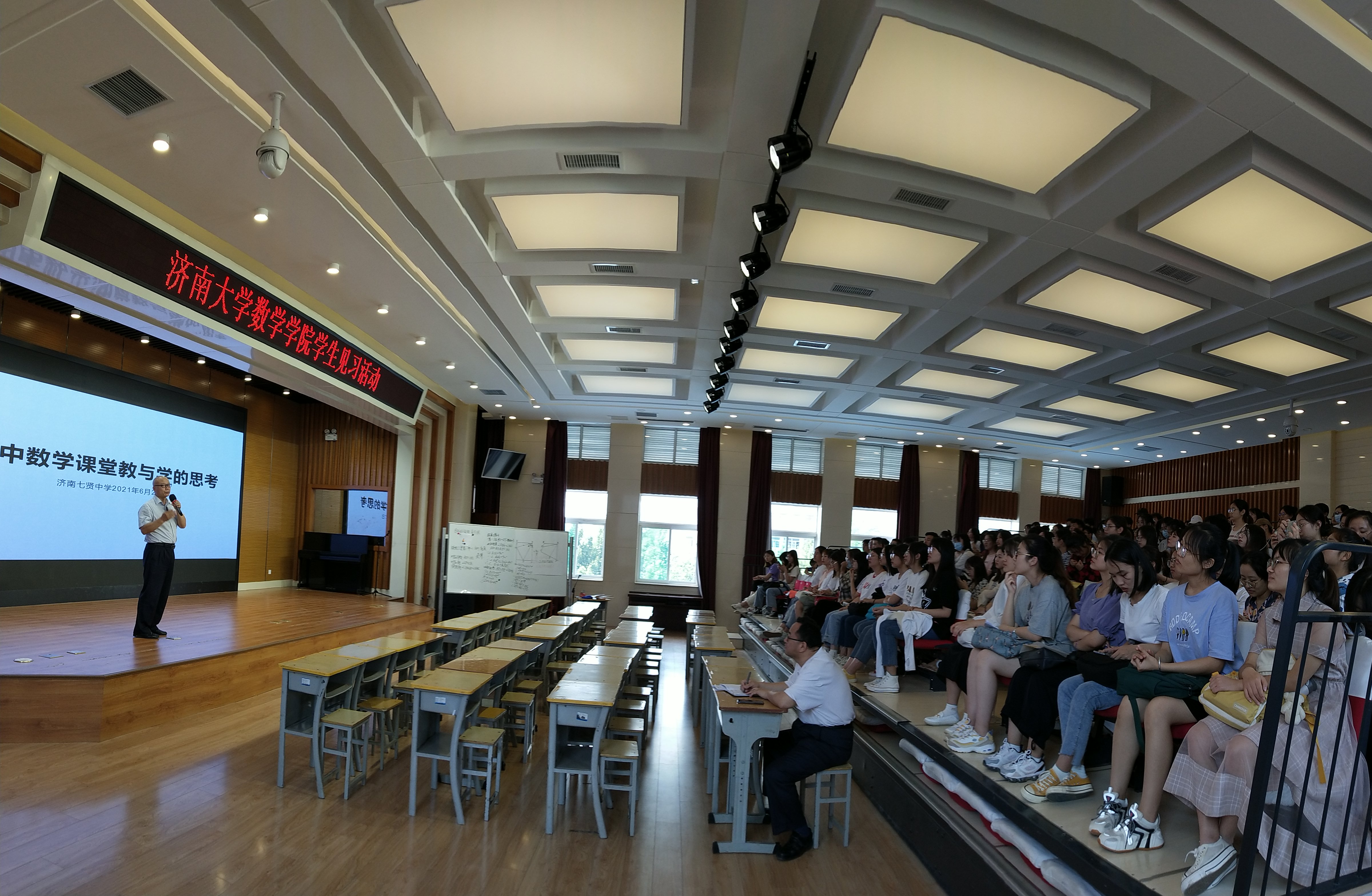 数学与应用数学专业2018级180名本科学生、5名教育硕士研究生,共同参加了本次教育见习活动。本次活动分别前往济南市七贤中学、育贤中学、舜耕中学、济南大学城实验高中,参加了包括公开课、优秀教师成长报告、数学教学研究报告、学校教学运行管理与青年教师成长、教师责任与师德培养等多场现场学习观摩活动。