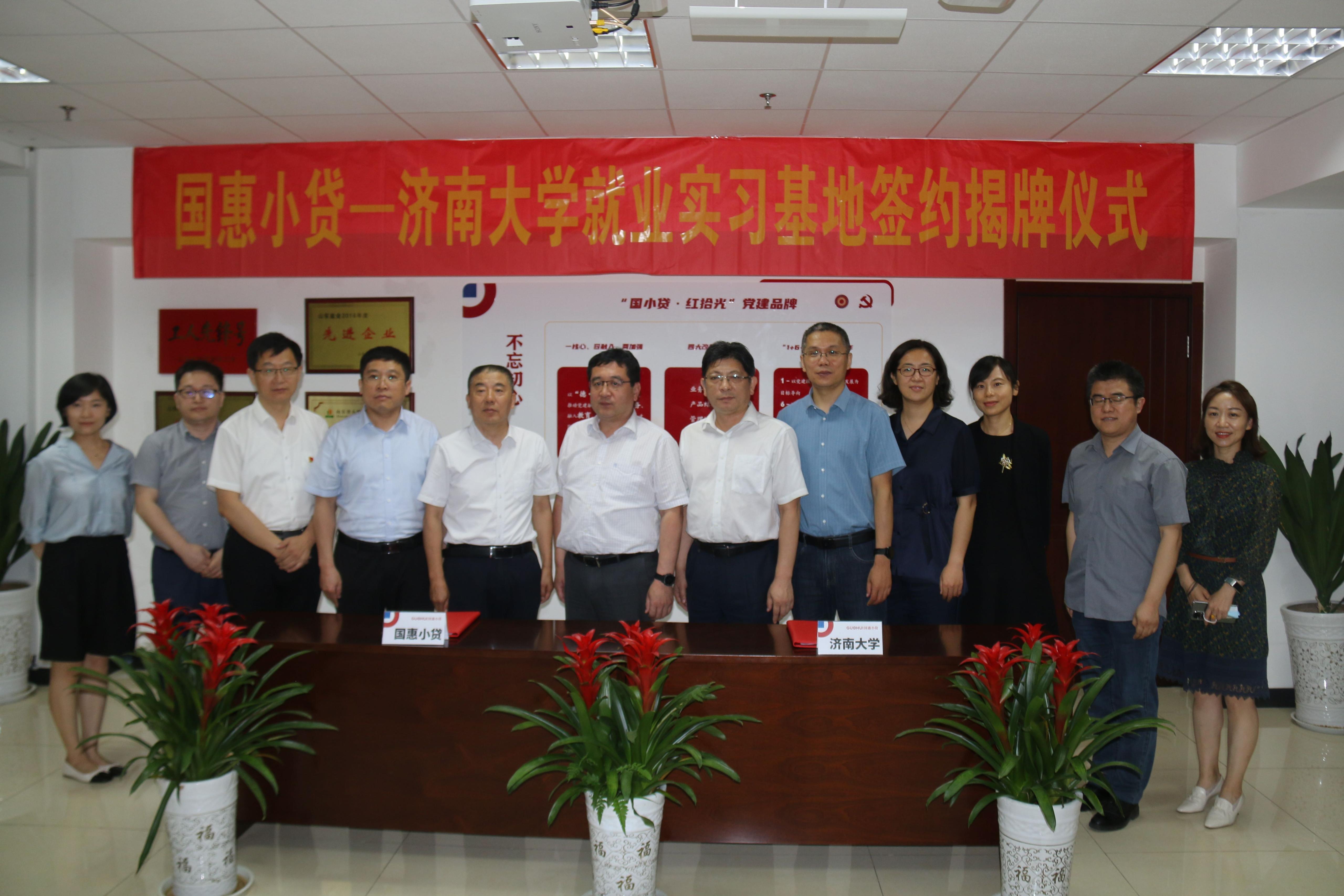 在山东国惠小额贷款有限公司,单一春介绍了公司“十四五”战略发展规划、基本情况、党建品牌、企业文化以及人才“引用育留”机制,表达了希望更多优秀毕业生加入企业的愿望。杨景波与杜冰共同为“济南大学就业实习基地”揭牌。孙元功、单一春代表校企双方共同签署了《共建济南大学毕业生就业基地协议书》。