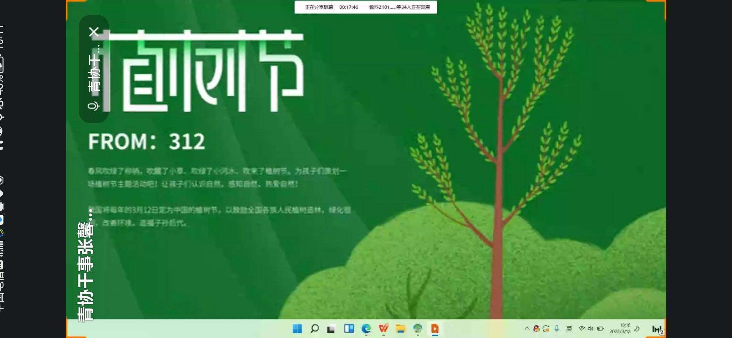 因疫情原因,此次活动采取线上方式进行。活动开始,负责人员先为同学们讲解了植树节的由来以及与之相关的法律法规,并介绍了该节日的起源自孙中山先生的倡导,让同学们对植树节的历史有了更加深入的了解。同时,负责人通过列举植树节邮票的来历以及历史上美国内布拉斯州的环境改善说明了植树节的重要意义。随后主讲人向大家展示了我国的植树节图标,讲解了植树节图标所蕴含的深远意义。活动最后,负责人向大家展示了我国历经几十年不懈努力积极植树造林后环境的改善以及林业资源的发展,据此向同学们发出积极倡导,倡导同学们保护环境,爱护树木。至此,本次活动圆满结束。