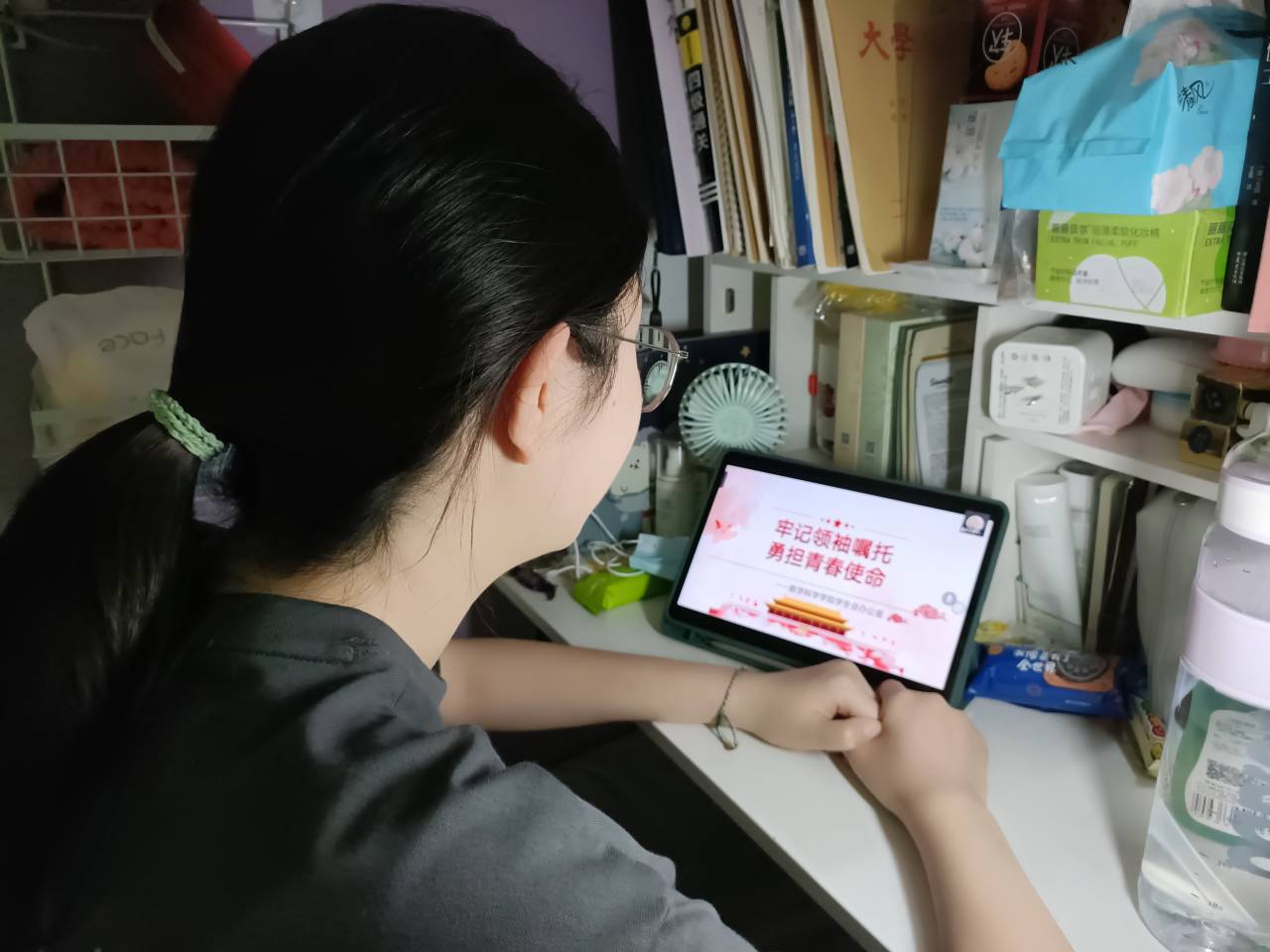在活动开始前,同学们自主学习了习近平总书记在庆祝中国共产主义青年团成立100周年大会上的重要讲话。活动开始后,活动主持人领学了习近平总书记重要讲话,并表示,作为一名共青团员,我们要坚决听从党和人民召唤,在青春的赛道上奋力奔跑,争取跑出当代青年的最好成绩!随后,同学们就如何成为一名合格的共青团员展开讨论。数学2101班米浩杰认为:“作为新时代的青年大学生,我们要牢记习近平总书记的嘱托,珍惜时间,担负时代使命,在担当中历练,在尽责中成长。”数学2103班郑慧颖说:“历史的接力棒已经交到我们手中,我们唯有自信自强、主动作为、勇挑重担,才能把握机遇,奋发勇为。”最后,大家观看《有我》宣传片,共同感悟将青春小我融入祖国大我的时代精神。