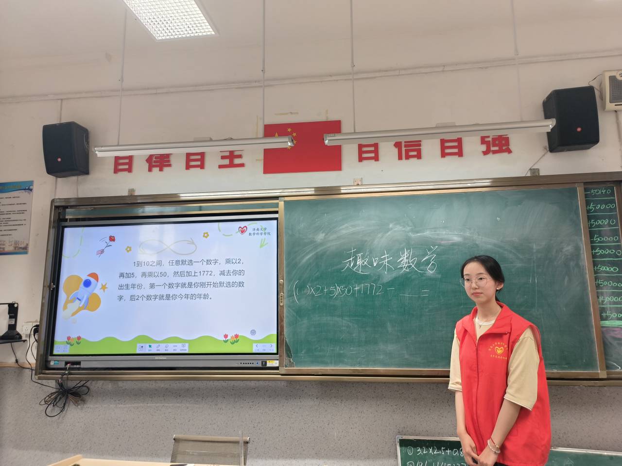 志愿者们首先用热场小游戏来吸引学生们的注意力,通过简单却充分展示数学知识的小游戏来计算学生们的年龄,成功使小朋友们在游戏中学数学,在快乐中长知识。随后,志愿者们又向学生们详细介绍了卡普雷卡尔黑洞,用生动形象的动画展现了数学黑洞的神奇之处,同时也充分展现了数学魅力与趣味。接下来,志愿者们又通过“神奇的数字”合作活动,实现了学生们共同走进数学的大本营,与数学共同成长。同时,小朋友们集体交流游戏发现,分享讨论他们的体会,在快乐中学习数学,在数学中享受快乐。最后,志愿者们用脑筋急转弯和数学黑洞小体验结束此次活动,利用动画视频再次展现数学的奇妙之处。
