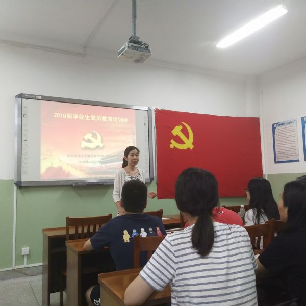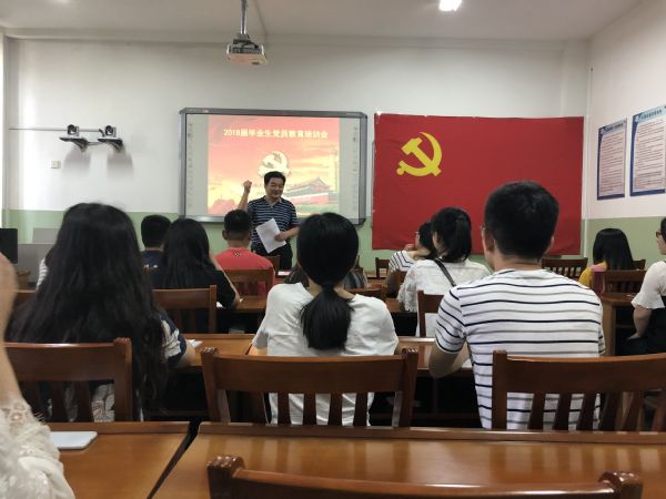 教育培训会由四个环节组成。首先,由韩书记带领毕业生党员重温入党誓词,同学们对着党旗,再次许下了铮铮誓言。之后,韩书记就同学们的毕业后发展方向,在校期间的党员素质培养,牢记习总书记教诲等三方面进行授课,并带领大家深入学习了习总书记在北京大学师生座谈会上的讲话。最后,韩书记用习总书记的话进行总结,并为同学们提出了四点要求:立国,立志,求真,立行。之后,孟书记就毕业生党员注意事项进行授课,他对毕业生党员应尽的义务,应承担的责任进行了深入剖析,并鼓励同学们踏实走好脚下的路。最后,由赵华磊老师组织开展主题党日教育:感恩母校,文明离校。她要求同学们在文明离校过程中发挥党员榜样示范作用,在走向社会后,继续秉承“弘毅 博学 求真 至善”的校训,为党旗添彩,为母校增光。